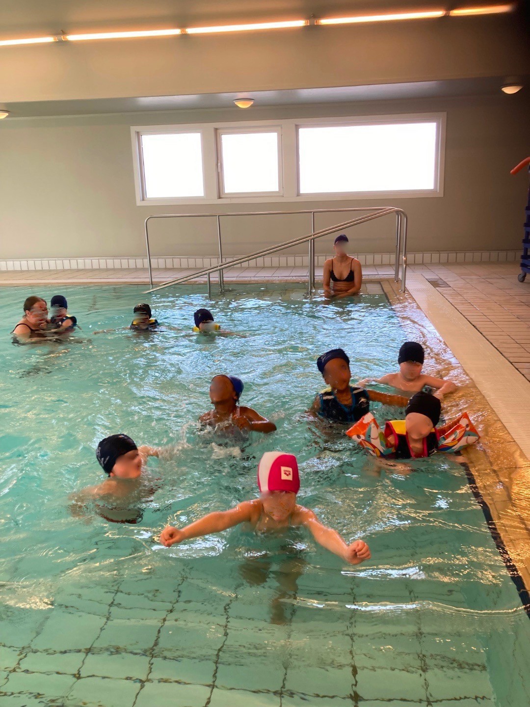 Vi starter i august med vanntilvenning, etterhvert øver vi oss på å flyte, svømme under vann, og etterhvert med hodet over vann. Vi leker og koser oss masse. Vi har bade vester barna kan ha på hvis de er utrygge i vannet.