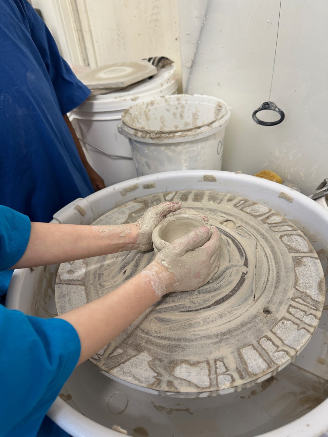 Førskole barna har arbeider i leire verkstedet, dette er første gang noen av barna barna prøver dreiehjulet. Det er gøy å få til å lage en liten skål:-) Vi lager mye forskjellig i leire som blir rå brendt før vi glaserer keramikken.